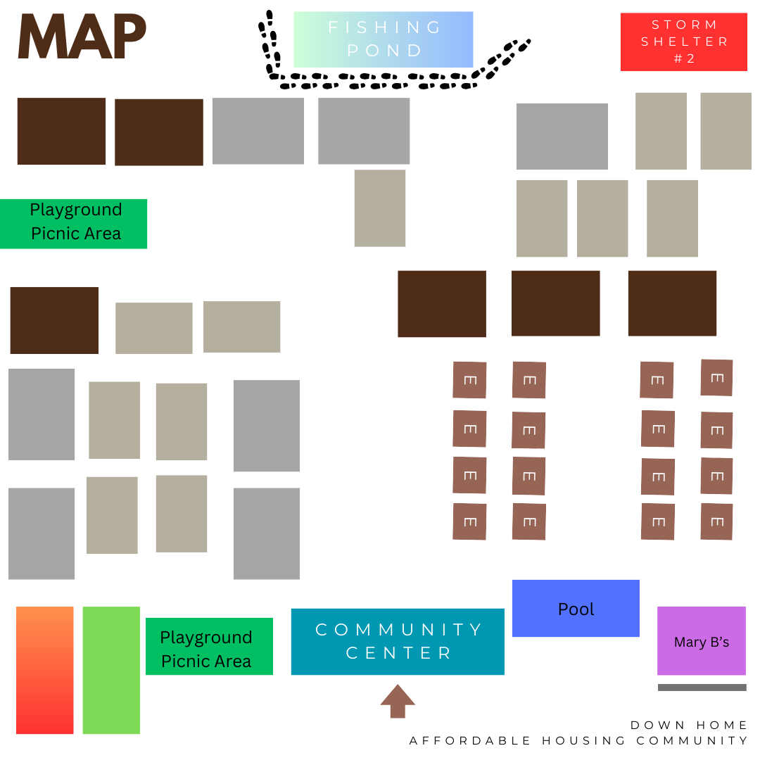 Down Home offers unique community attractions not seen in other communities. We offer shuttle bus service from the community to area shopping centers and connecting bus/train stations. Down Home has walking trails, accessible parks and a fully stocked pond for fishing. Down Home has a community center with a state of the art sensory room for special needs children and adults, exercise/weight room, conference rooms and internet cafe and a zero entry pool for families to stay cool all summer. The community center has a storm shelter to keep residents safe in case of a tornado or other natural disaster.